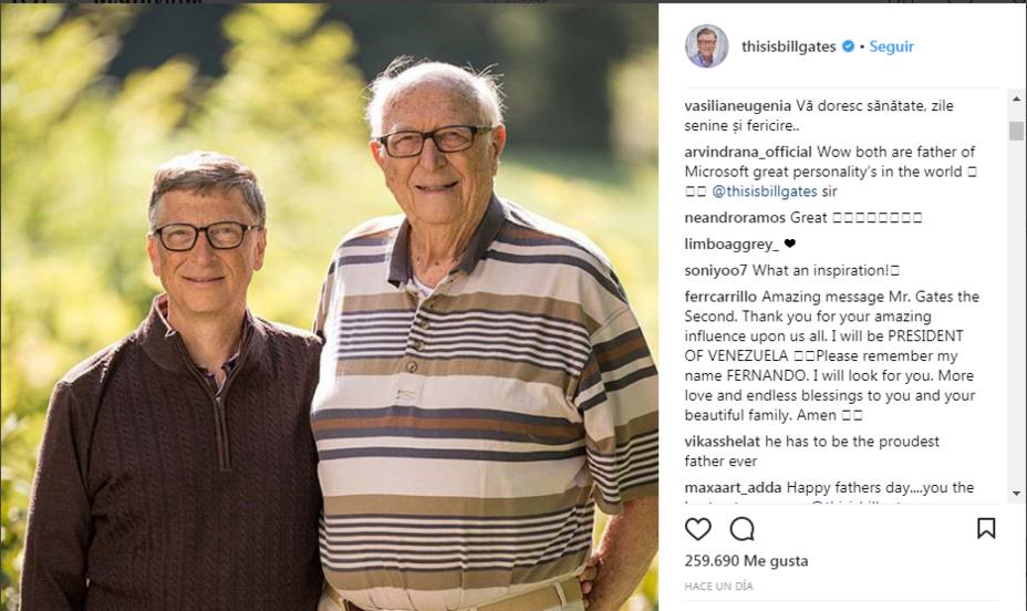 Gates compartió en su cuenta de Instagram una fotografía junto a su progenitor para celebrar el Día del Padre. Además, junto a la imagen, el empresario escribió: «Mi padre y yo compartimos el mismo nombre. Luego de iniciar con Microsoft, la gente le preguntaba si él era el real Bill Gates y yo siempre esperaba que él dijera: ‘Sí’ (…) Feliz día al real Bill Gates».