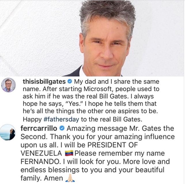 Por su parte, Fernando Carrillo comentó la publicación con el siguiente texto: «Increíble mensaje, señor Gates. Gracias por su increíble influencia sobre todos nosotros. Seré presidente de Venezuela. Por favor, recuerde mi nombre, Fernando. Te buscaré. Más amor y bendiciones infinitas para ti y tu hermosa familia».