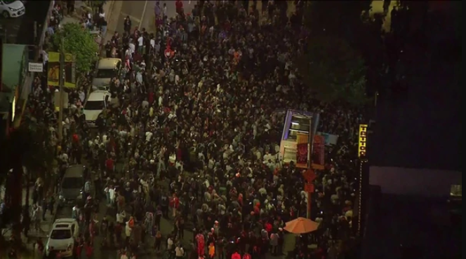 Helicópteros de los distintos medios de comunicación y de la oficina de la policía de Los Ángeles sobrevolaban la zona captando imágenes de los disturbios.
