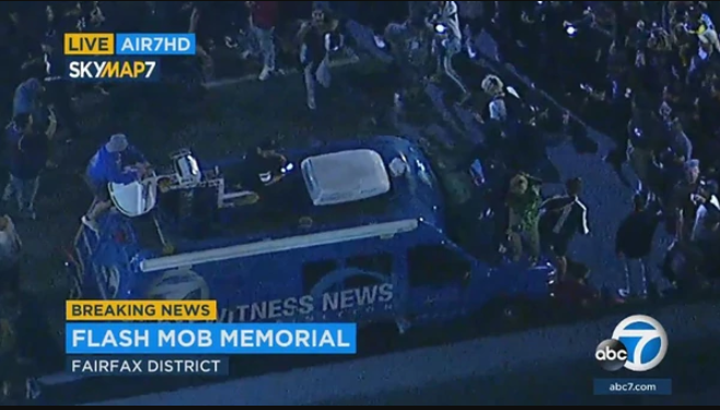 Más de mil personas se congregaron en West Hollywood el martes para conmemorar al fallecido artista, pero el evento que inició de manera pacífica se salió de control y tornó peligroso con algunos fanáticos arriesgando su vida al saltar desde los techos de los edificios hacia la multitud que se encontraba abajo.
