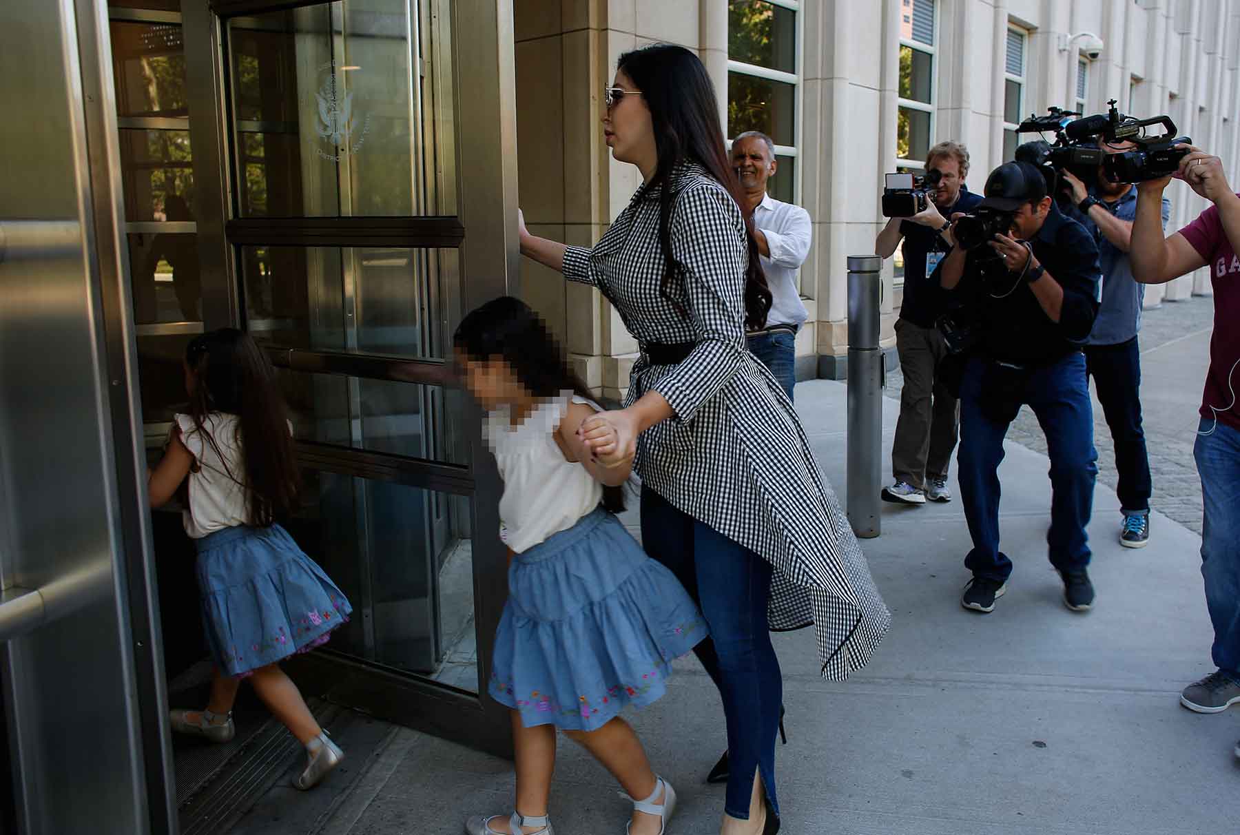 La joven de 28 años llegó acompañada de sus gemelas y el abogado de El Chapo, Eduardo Balarezo. Al salir de la corte, Emma fue asediada por los medios de comunicación.