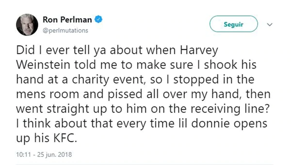 A través de su cuenta en Twitter, el reconocido actor relató un encuentro que tuvo con el director: «¿Algunas vez les conté cuando Harvey Weinstein me dijo que me convenía estrechar su mano en un evento de caridad, así que fui al baño, me oriné en la mano y después fui directamente a encontrarme con él en la recepción?»