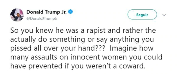 El hijo mayor de Donald Trump cerró la discusión con ironía: «Sí, claro. Tú y Meryl Streep eran las únicas personas en Hollywood que no tenían idea… Supongo que estaban muy ocupados lavándose las manos. Sabías que era ‘un idiota y un matón’ y perdiste el tiempo. Obviamente eres un hombre de grandes convicciones. O querías ser su perro faldero. ¡Débil!»