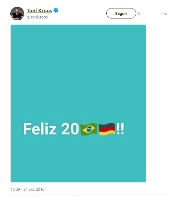 Toni Kroos deseó un feliz 2017 reemplazando el 1 con la bandera de Brasil y el 7 con la de Alemania.