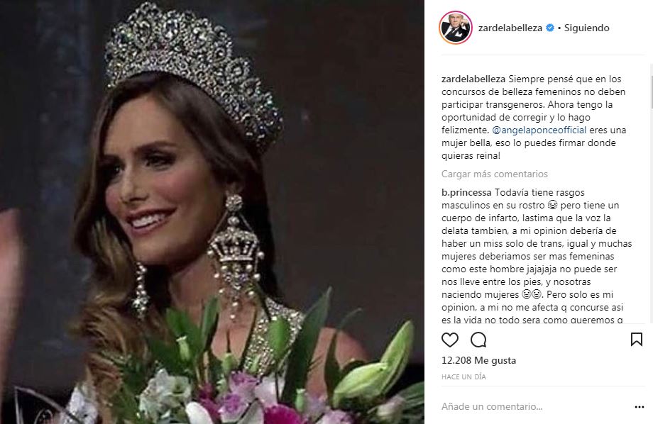 «Siempre pensé que en los concursos de belleza femeninos no deben participar transgéneros. Ahora tengo la oportunidad de corregir y lo hago felizmente. @angelaponceofficial eres una mujer bella, eso lo puedes firmar donde quieras reina!» escribió en el pie de la foto.