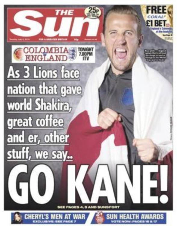 La portada en cuestión dice… «Los 3 Leones se enfrentan a una nación que le dio al mundo a Shakira, un gran café y, eh.. otras cosas, nosotros decimos ¡vamos Kane!».
