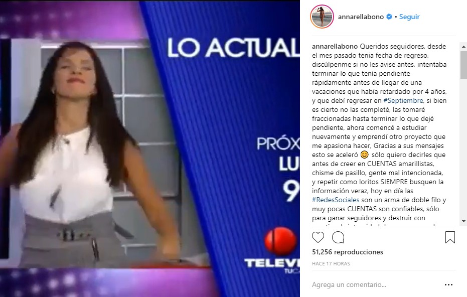 Ahora, Annarella Bono vuelve a acaparar los medios de comunicación especializados en farándula al confirmar que regresará a las pantallas de Televen el próximo lunes 9 de julio, así lo dio a conocer a través de su cuenta de Instagram, donde explicó que se había tomado unas vacaciones que «había retardado por 4 años».