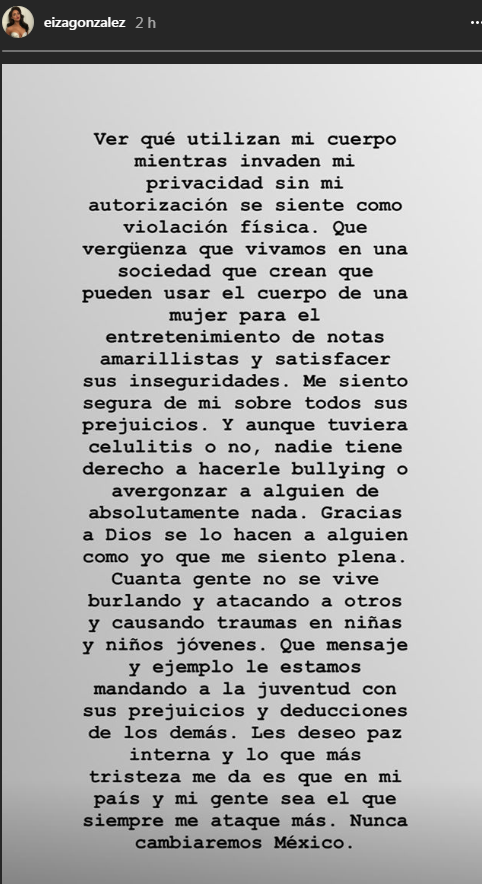 “Invaden mi privacidad sin mi autorización. Se siente como violación física. Que vergüenza que vivamos en una sociedad que creen que puedan usar el cuerpo de una mujer para entretenimiento de notas amarillistas y satisfacer sus inseguridades”, señala en Instagram.