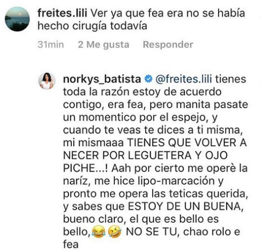 En un video en el que se se muestra la participación de Batista en el Miss Venezuela, una usuaria comentó que era «fea» antes de haberse hecho operaciones, refiriéndose a la protagonista de «Orgasmos» la obra de teatro. A lo que la artista contestó que tenía razón, que era fea, pero que debía pasar por el espejo.