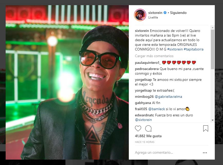 «Emocionado de volver!!! Quiero invitarlos mañana a las 8pm (ve) al live desde aquí para actualizarnos en todo lo que viene esta temporada ORIGINALES CONMIGO!!!» fue el mensaje con el que el cantante Sixto Rein anunció su regreso luego de varios meses de ausencia.