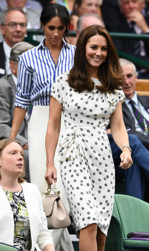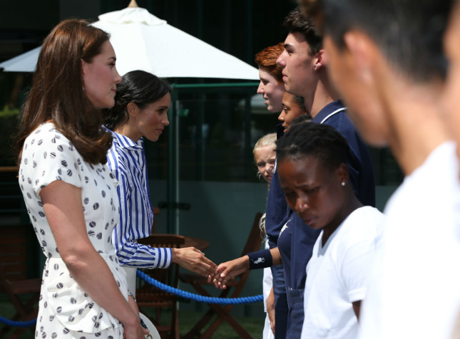 Por su parte, la duquesa de Cambridge utilizó un sencillo vestido blanco con estampado de lunares azules. Antes del partido, ambas pasaron a saludar a las jugadoras e hicieron chistes con los recoge pelotas.