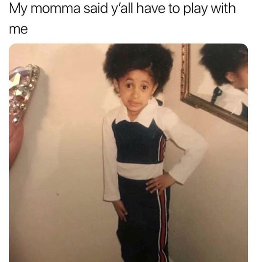 La cantante Cardi B publicó en Instagram una foto en la etapa de su infancia. Escribió la frase «Mi mamá dice que tienes que jugar conmigo», lo que no se imaginaba, es que la imagen sería utilizada por los usuarios de la plataforma 2.0 para elaborar incontables memes.