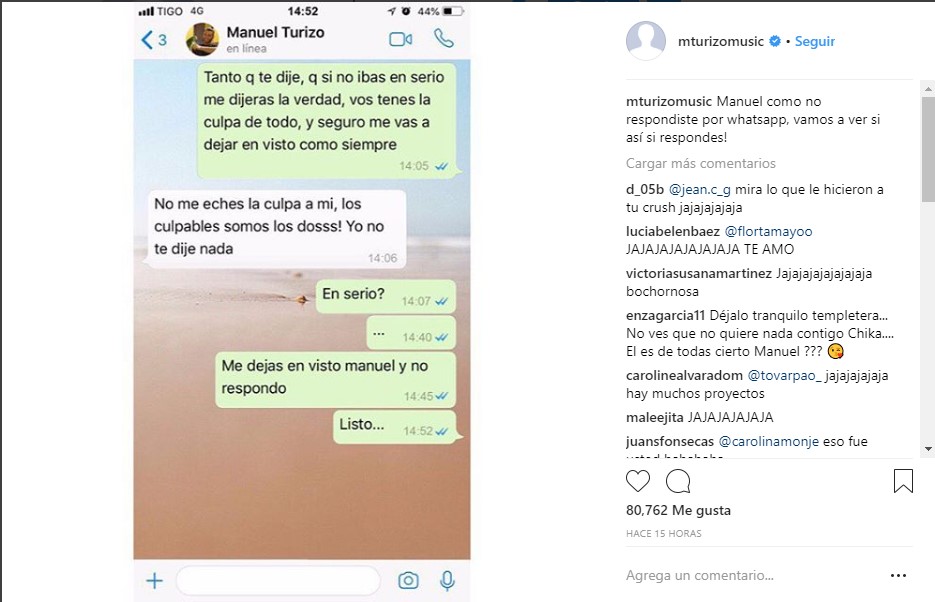 En la imagen, pueden leerse mensajes de lo que pareciese ser una persona despechada reclamándole a Turizo por «no ir en serio». Luego, amenaza al cantante con: «Me dejas en visto Manuel y no respondo» y, más tarde, escribió: «Listo», informando que ya había tomado acciones en el asunto.