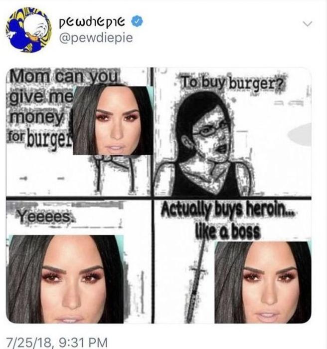 El meme, donde se ve a Demi Lovato gastando su dinero en heroína, fue publicado horas después de que se supiera que había sido ingresada en el hospital por una sobredosis, algo que, como era de esperar, indignó a muchos de los seguidores de PewDiePie en Twitter.