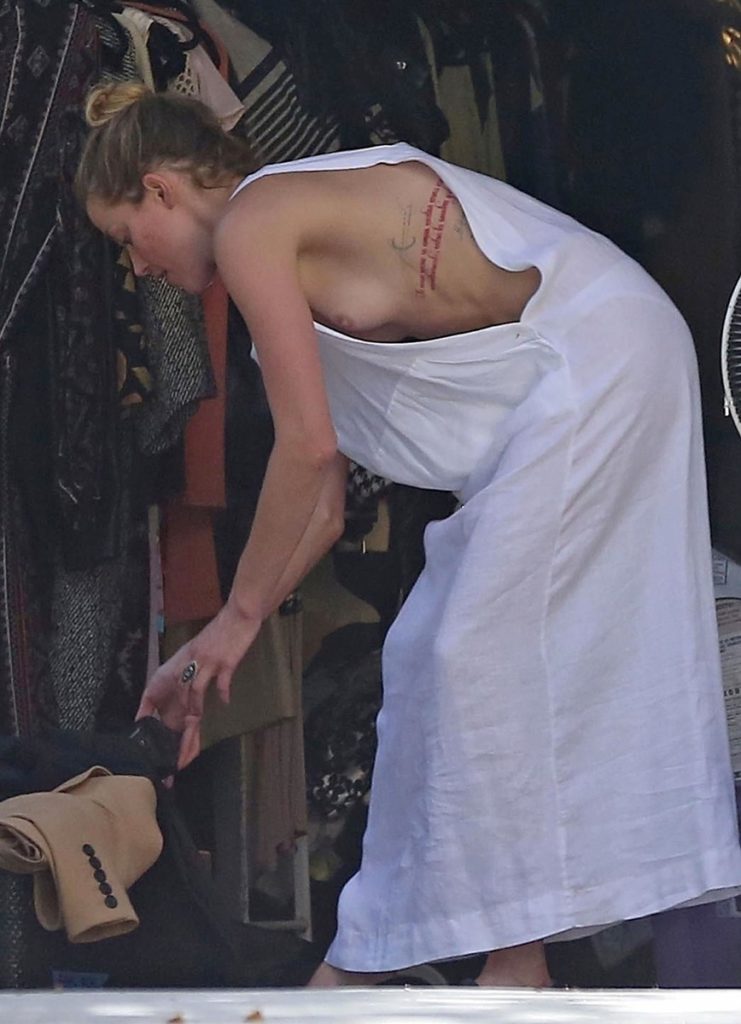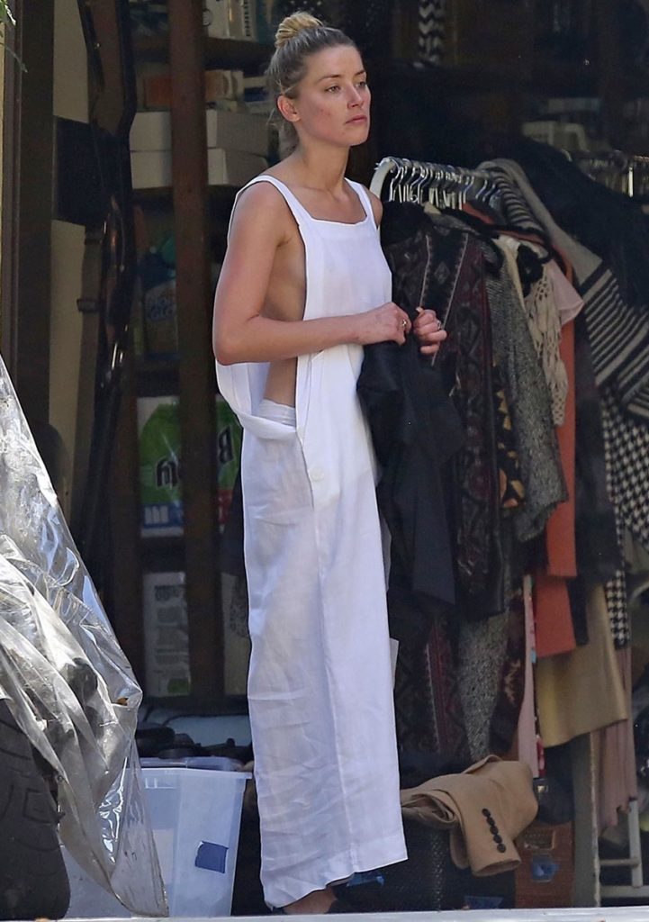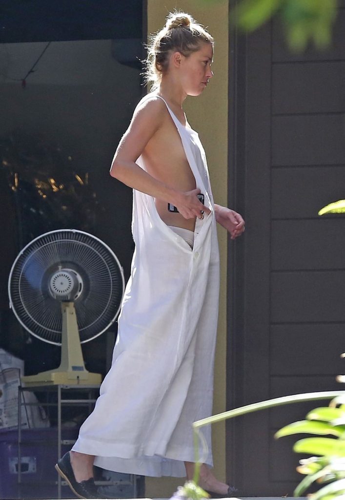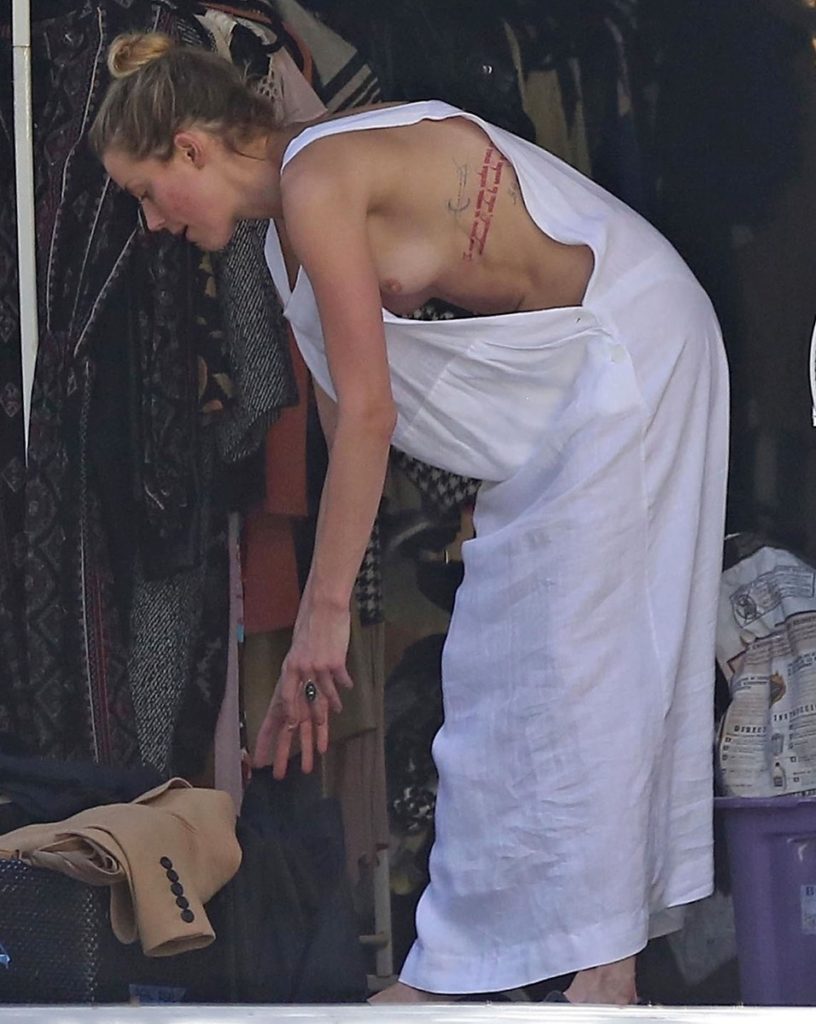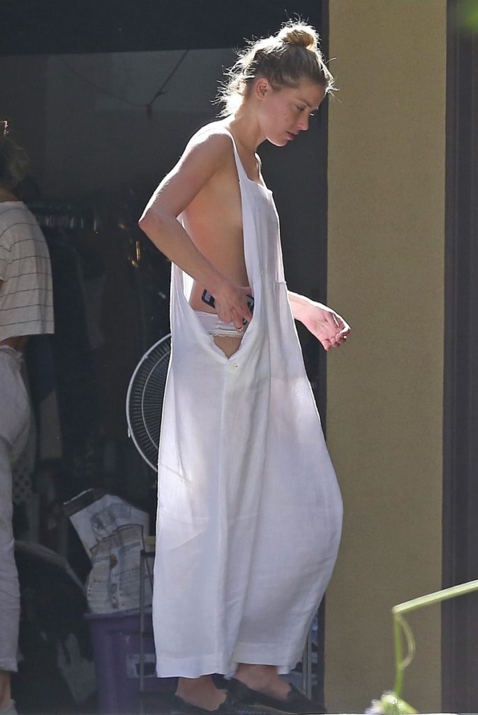 Amber Heard, que vestía un vestido blanco con un gran abertura en los costados y sin sujetador, expuso uno de sus senos cuando se inclinaba a recoger a alguno de los objetos.