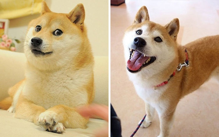 En 2010, una profesora de guardería japonesa publicó fotos de su perro adoptado Kabosu poniendo distintas caras. Una de ellas se convirtió en la primera imagen de «doge».
