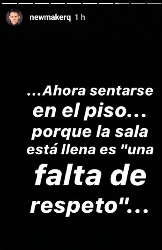 Ante esto, los actores Newmaker Quintero y Adrián González recurrieron a sus redes sociales para dar su punto de vista sobre lo ocurrido. El animador de La Bomba escribió: «Nunca he logrado entender el ego de algunos ‘artistas’ venezolanos (…) Definitivamente la humildad es un privilegio del cual muy pocos gozan… Ahora sentarse en el piso, porque la sala está llena, ‘es una falta de respeto'».