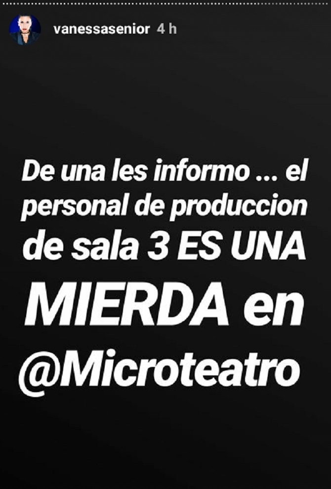Sin embargo, Vanessa Senior, quien siempre ha apoyado la movida teatral en el país, publicó en su Instagram: «De una les informo… el personal de producción de la sala 3 es una mierda en @Microteatro». Luego, publicó una serie de videos en los que explicó que le pidieron que entrara a la sala luego de todas las personas que habían comprado su entrada, porque la influencer tenía un carnet de invitada.