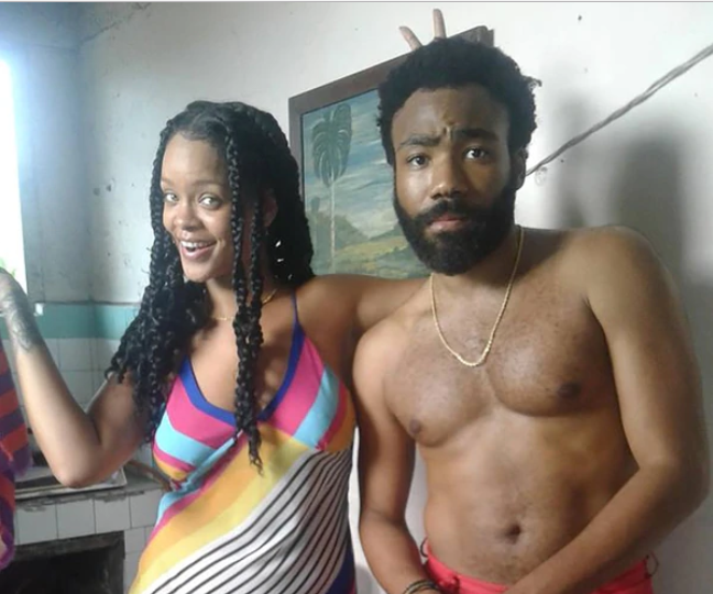 Rihanna luce sonriente con un vestido a rayas de muchos colores con el pelo recogido en trenzas y haciendo la señal de paz. Donald Glover, sin camiseta, sostiene una guitarra.