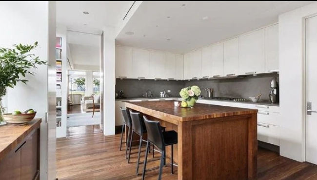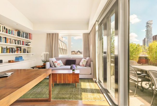 A la vivienda, que la actriz y su marido compraron en 2006 por USD 10,13 millones, se accede por un ascensor privado, y en su espacio interior de casi 370 metros cuadrados se hallan una gran sala de estar con biblioteca, una cocina con isla y una pequeña oficina.