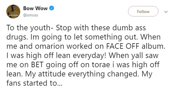«A la juventud, paren ya con estas drogas estúpidas. Voy a confesar algo. ¡Cuando Omarion y yo trabajamos juntos en el disco Face Off yo estaba completamente drogado con Lean todos los días! Cuando me vieron en BET peleando con Torae estaba drogado con Lean. Me cambió mi temperamento, me cambió todo. Me hizo pelearme hasta con mi familia”, mencionó el cantante.