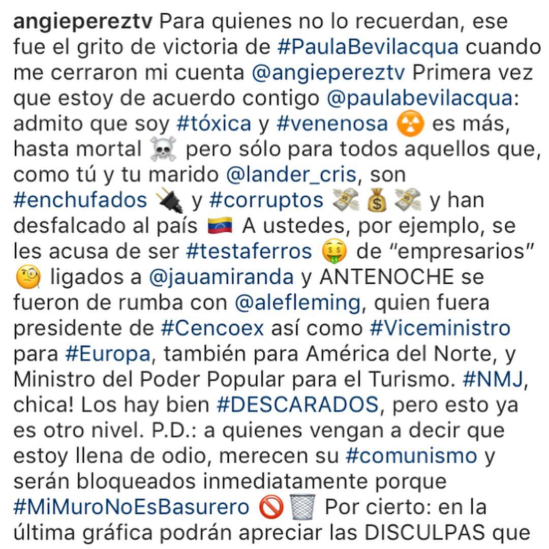 La actriz recibió muchísimos comentarios negativos: «Claro ella también disfruta del dinero robado a los venezolanos @paulabevilacqua Descarada y vergüenza debería darte», «osea a mi me da igual tener como amigos a asesinos, ladrones, narcotraficantes y terroristas…yo soy bien tolerante…. El que trate con chavistas, enchufados, y los luzca, es una basura más. PUNTO. El pase de factura vendrá», fueron algunos de los comentarios de los usuarios en Instagram.