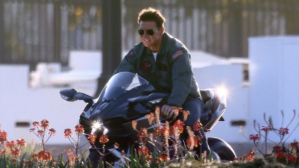 La estrella de cine, de 56 años, que repite su papel de LT Pete ‘Maverick’ Mitchell, filmó escenas a bordo de una motocicleta caracterizando nuevamente al personaje que le valió la fama internacional.
