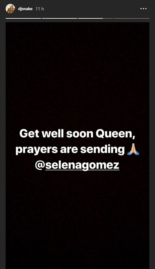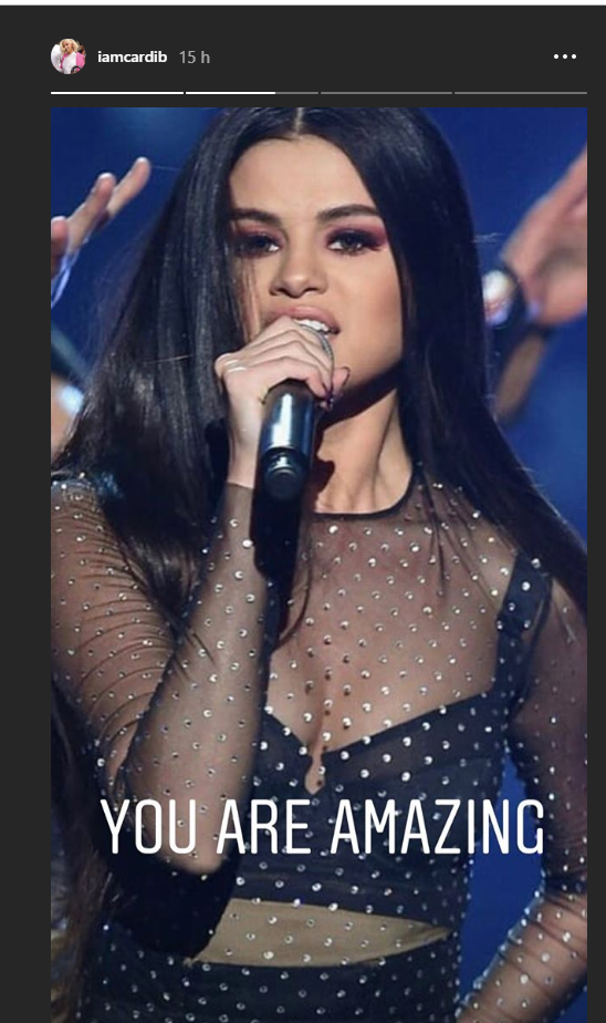 «Eres increíble», escribió Cardi B sobre una fotografía de Selena Gomez que fue publicada en sus historias de la red social Instagram, mientras que Dj Snake hizo lo suyo con una oración para su pronta recuperación de la intérprete de «Back to You».