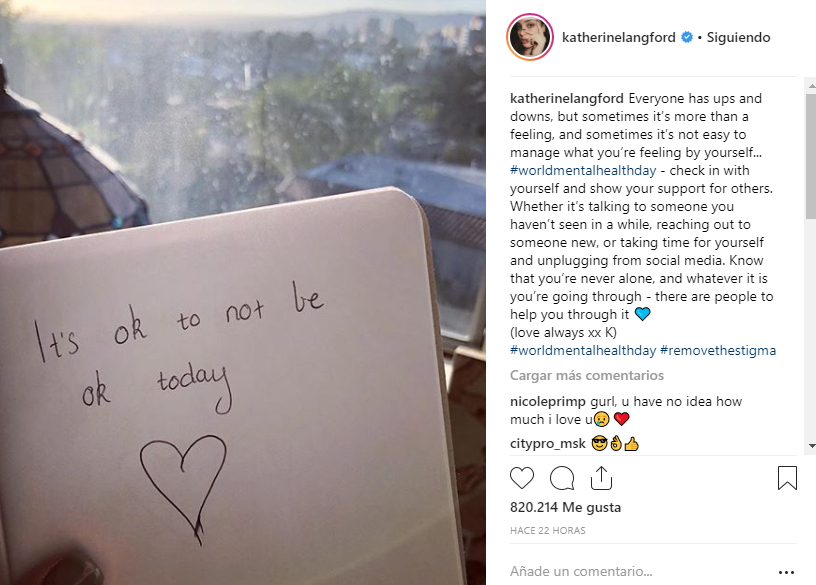 Del mismo modo, la actriz Katherine Langford, de «13 Reasons Why», dejó emotivo mensaje con referencia a la salud mental en el que indicó que a veces los problemas parecen «ir y venir».