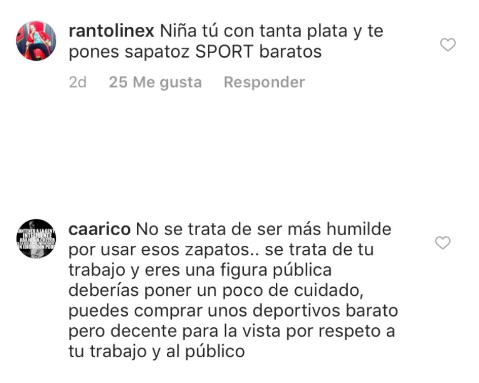 Los seguidores no tardaron en defender a la animadora y darle apoyo ante tantos comentarios negativos recibidos en las redes sociales.«Lo que te pongas te queda bien, así que por mi, repite lo que quieras, muchacha bella. No le pares bola a los que critican eso. Si llega una tienda que te patrocine, chévere»,»excelente reflexión a mi me encantan tus zapatos, además la gente es tan sin oficio que se fijan en algo que a estas alturas de la vida es insignificante señores Venezuela está en crisis ocupense de ustedes mismos para mi esta chica es super, bendiciones», «Asi es mija ,más clara y acertada imposible», fueron algunos de los comentarios de los fanáticos de la venezolana.