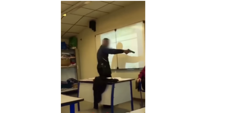 Los hechos ocurrieron en el instituto Édouard Branly de Créteil, al lado de París. En las imágenes se puede ver como un menor apunta con una pistola a la cabeza de la profesora mientras otro graba y se ríe. El chaval quería que la maestra firmara su asistencia a clase.