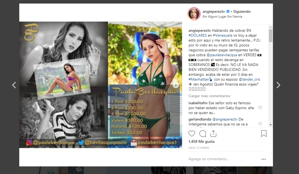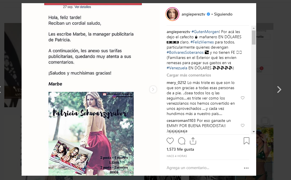 A través de las redes sociales, la periodista, ganadora del Emmy y ex mamacita de Urbe Bikini, Angie Pérez reveló la tarifas publicitarias para publicaciones en Instagram de dos artistas venezolanas. Pérez, publicó en su cuenta las tarifas de Patricia Schwarzgruber y Paula Bevilacqua, ambas actrices cobran en $ por stories y publicaciones, una más cara que la otra.