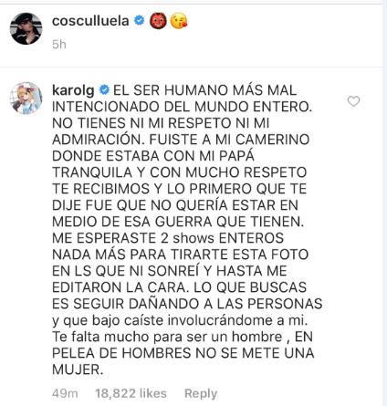 Recordemos que el cantante tiene una fuerte rivalidad con otro representante del género y supuestamente novio de Karol G, Anuel, por esta razón la cantante consideró la acción de Cosculluela una provocación y un gesto malintencionado para el que ha sido utilizada, pues entre ambos artistas masculinos han habido fuertes enfrentamientos en el pasado con demanda judicial incluida.
