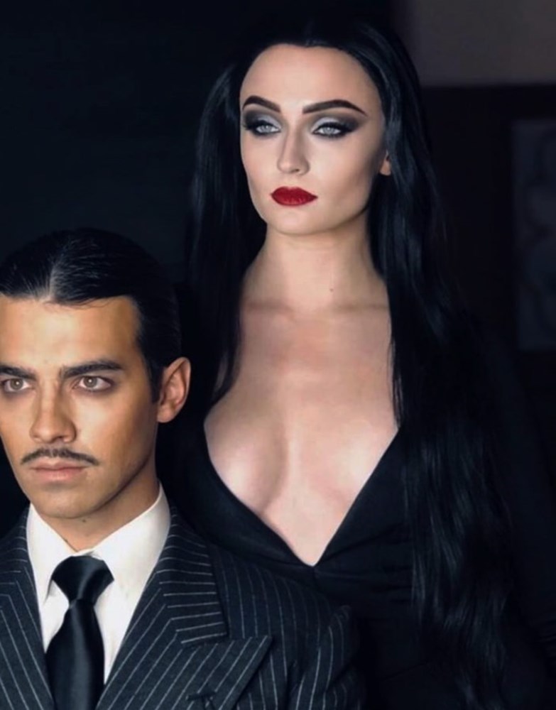 Sophie Turner aterrorizó y nos calentó en el lugar 3 con su traje de escote profundo,muy fúnebre, imitando a Moriticia y si… también la acompaña su novio, Joe Jonas