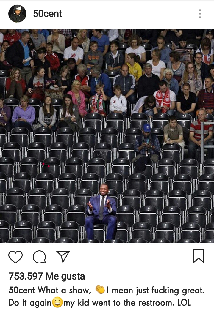 El objetivo fue dejar las sillas vacías. La enemistad entre ambas figuras es de vieja data. En un costoso y elaborado intento de fastidiar a su rival, 50 Cent admitió en Instagram haber comprado unos 200 tickets, a través de Groupon, para el reciente concierto del 27 de octubre, de su enemigo público. «Acabo de comprar 200 asientos de primera fila para que se queden vacíos. LOL … Lol $15 por silla que no se pueden perder, adquirí 200 tickets por tres filas… Que gran show, es decir jodidamente genial. Lo haría de nuevo tan frecuentemente como ni hijo va al baño. LOL«, comentó orgullosamente en varias publicaciones de IG.