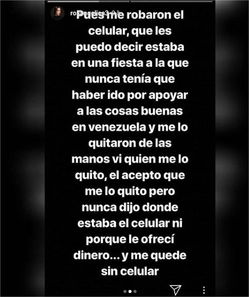 En sus historias de Instagram la ex miss reveló: «Estaba en una fiesta a la que nunca tenía que haber ido por apoyar a las cosas buenas en Venezuela y me lo quitaron de las manos”