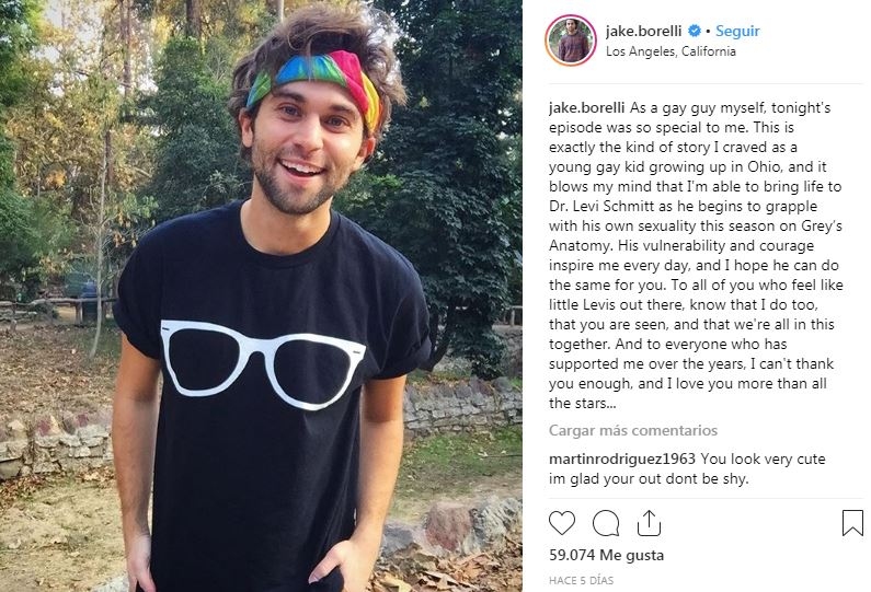 El actor Jake Borelli, quien da vida al Dr. Levi Schmitt en la serie Grey’s Anatomy, reveló hace algunos días en su cuenta de Instagram que es homosexual.