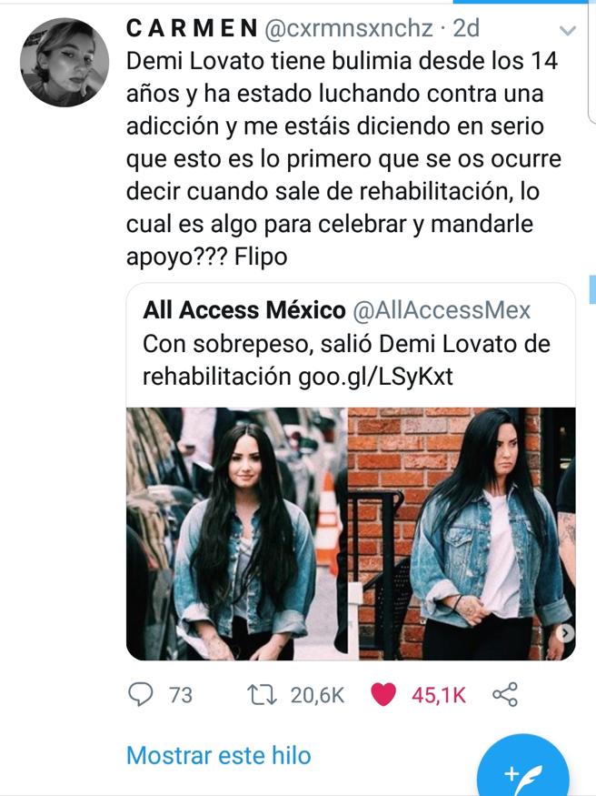 “Con sobrepeso, salió Demi Lovato de rehabilitación”, titulaba un artículo de la prensa mexicana que rápidamente comenzó a ser compartido por las fans, quienes no podían estar más indignados. “Demi Lovato tiene bulimia desde los 14 años y ha estado luchando contra una adicción y me están diciendo en serio que esto es lo primero que se les ocurre decir cuando sale de rehabilitación, lo cual es para celebrar y mandarle apoyo?”, escribía en Twitter una de las fans de la artista.