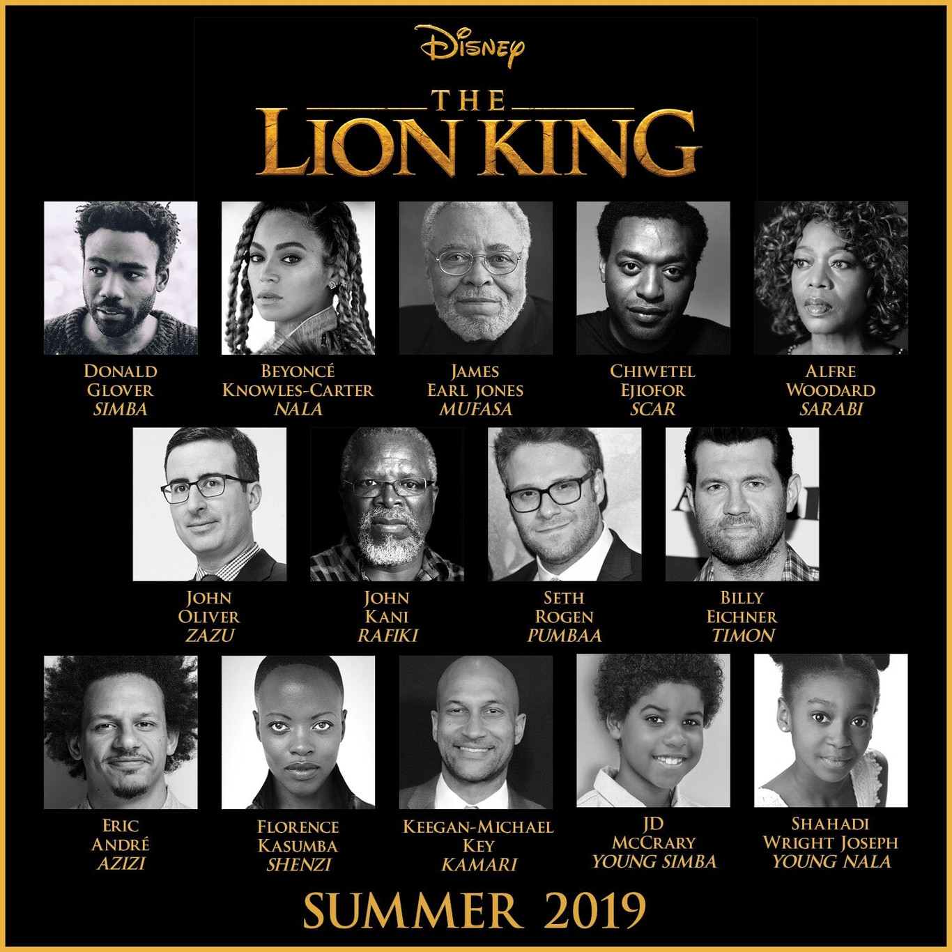 Cabe destacar que el reparto de la versión original en inglés incluye a Donald Glover poniendo la voz de Simba, Beyoncé en el papel de Nala, James Earl Jonescomo Mufasa, Alfre Woodard como Sarabi, Chiwetel Ejiofor como Scar, Billy Eichner como Timón, Seth Rogen como Pumba, Keegan-Michael Key como Kamari y John Oliver como Zazu. En España, muchos fans de la original echarán de menos a Constantino Romero, que aquí fue la voz de Mufasa.