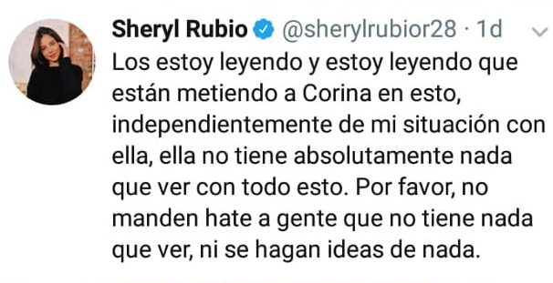 “Los estoy leyendo y estoy leyendo que están metiendo a Corina en esto, independientemente de mi situación con ella, ella no tiene absolutamente nada que ver con todo esto. Por favor, no manden hate a gente que no tiene nada que ver, ni se hagan ideas de nada”, fueron las palabras de Sheryl.