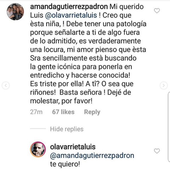 “Mi querido Luis, creo que esta niña, Debe tener una patología porque señalarte a ti de algo fuera de lo admitido, es verdaderamente una locura, mi amor pienso que esta señora esta buscando la gente icónica para ponerla en entredicho y hacerse conocida, Es triste por ella, A ti? Osea que riñones! Basta señora! Deje de molestar, por favor.”, escribió Amanda.