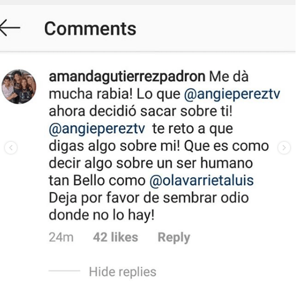 Es por esto, que Amanda se pronunció a favor de Luis Olavarrieta y en contra de Angie Pérez. La primera actriz comentó la publicación de Instagram donde Luis Olavarrieta se defiende de quiénes lo tildan de «enchufado».