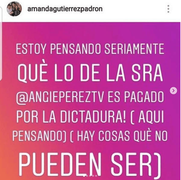 Después de hacer todos estos comentarios, la primera actriz le dedicó un post en Instagram a Angie Pérez: “Estoy pensando seriamente que lo de la señora Angie perez es pagado por la dictadura, aquí pensando hay cosas que no pueden ser”, escribió. Sin embargo, la actriz a las pocas horas eliminó la publicación.