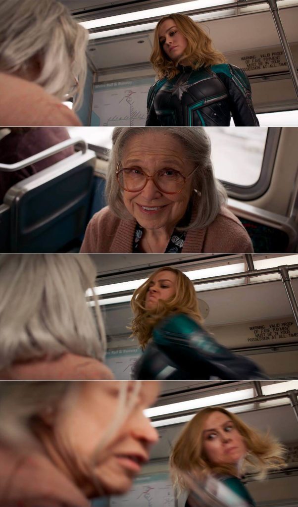 Además, también podemos ver a un joven Nick Fury (interpretado una vez más por Samuel L. Jackson) aún con sus dos ojos, haciendo equipo con la capitana, así como también a otros miembros del ejército Kree y, sobre todo, una brutal escena (casi completa) donde la superheroína le cae a piña a una abuela en el autobús, dicho momento ha sido viralizado en la Internet.
