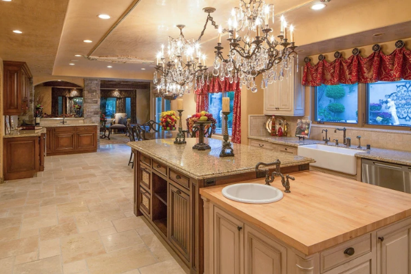 La casa de siete habitaciones y nueve baños está situada en casi un acre de tierra detrás de grandes puertas. La finca de inspiración mediterránea tiene una cocina de chef gourmet con sala de desayunos que cuenta con dos candelabros y tres lavamanos.