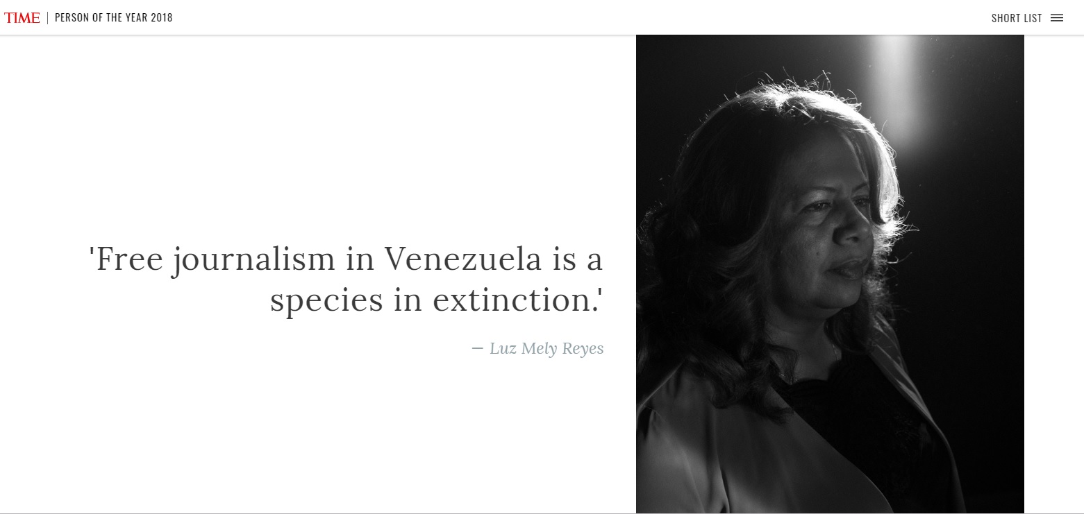 Luz Mely Reyes, directora y co-fundadora del portal de noticias Efecto Cocuyo, fue incluida en el reportaje «Persona del año» de la revista Time, que anualmente honra a hombres, mujeres o grupo de personas cuyas acciones generaron gran impacto en la sociedad durante el año.