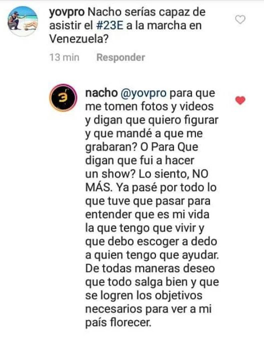 Parece que toda esta polémica ha hecho que al cantante no le queden ganas de volver, así lo confirmó a través de Instagram cuando respondió el comentario de una usuaria que le preguntó si se sumaría a la marcha convocada este 23 de enero por la oposición venezolana.