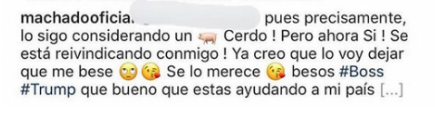 En un comentario emitido a través de sus redes sociales la venezolana aseguró que se dejaría besar por el mandatario americano. El comentario surgió en una fotografía publicada por Machado donde mostraba a su hermano en la marcha de este 23 de enero.