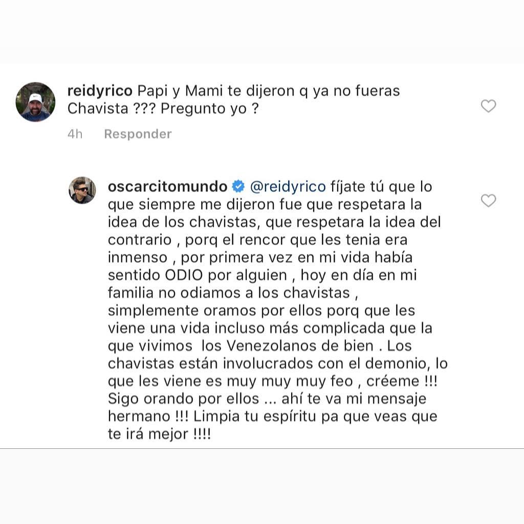 El también productor compartió una foto en donde responde a un comentario de un usuario que señala: «Mami y papi te dijeron que ya no fueras chavista?». A lo que el artista respondió de forma larga y contundente.
