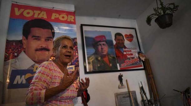 «En él (Maduro) está Chávez (…) él no va a caer, va a seguir el camino, todo lo que hizo Chávez, lo va a continuar él«, dice mirando los retratos del líder socialista. En uno, viste uniforme verde oliva y boina roja, color símbolo de la revolución.